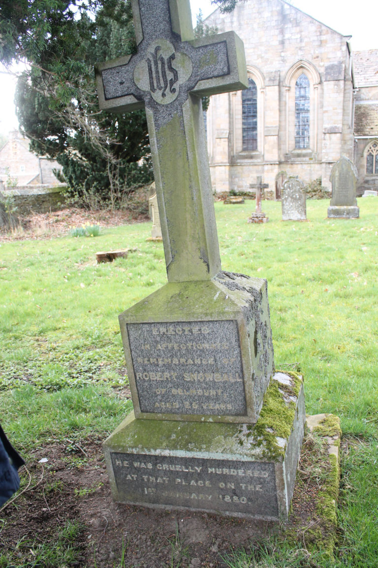 On New Year's Day 1880, the 'Blanchland Murder’ took place. Robert Snowball, the master of the house, was hit in the head from behind, so brutally that his teeth were knocked out and the hammer was half embedded in his skull. This is his gravestone.